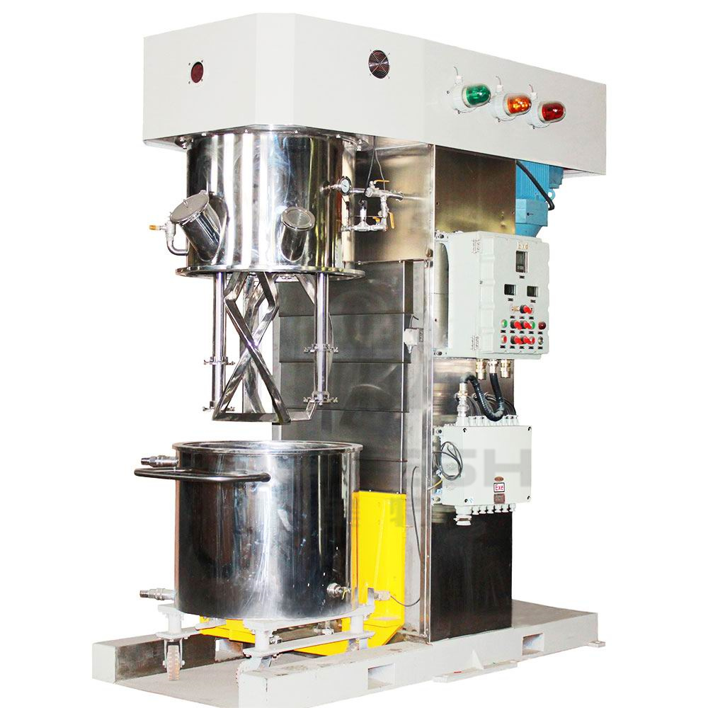雙行星動(dòng)力混合機是一種新型且對多種混合液體、粉體進(jìn)行攪拌、溶解、分散、均質(zhì)效率好的攪拌設備。該設備配有高速、低速、活動(dòng)刮板部件,低速攪拌部件采用行星齒輪傳動(dòng),攪拌槳在公轉時(shí)也自轉,使物料上下及四周運動(dòng),從而在較短的時(shí)間內達到理想的混合效果。高速分散/乳化部件與行星箱一起公轉,同時(shí)高速自轉,使物料受到強烈的剪切與分散混合,罐體內壁為大型立車(chē)精加工,再經(jīng)大型拋光機自動(dòng)拋光,確保行星箱上的活動(dòng)刮刀在旋轉時(shí),把罐體內壁上的物料完全刮掉,其混合效果是普通混合機的幾到幾十倍。多應用于電池、有機硅膠、好油墨、染料、粘膠劑、高粘度涂料等化工產(chǎn)品的生產(chǎn)。